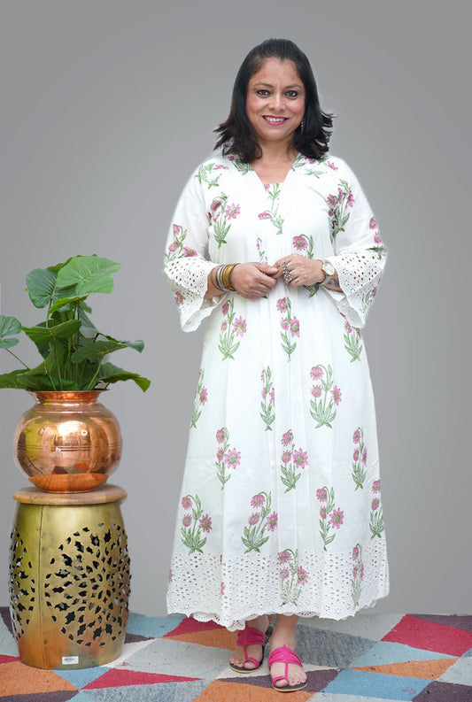Pink Hand Block Schiffli Kurti/ ...