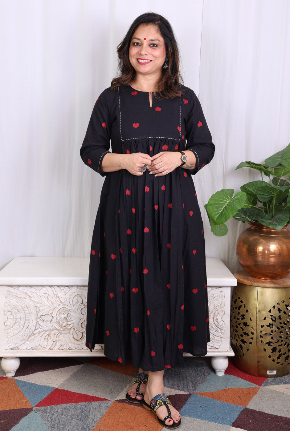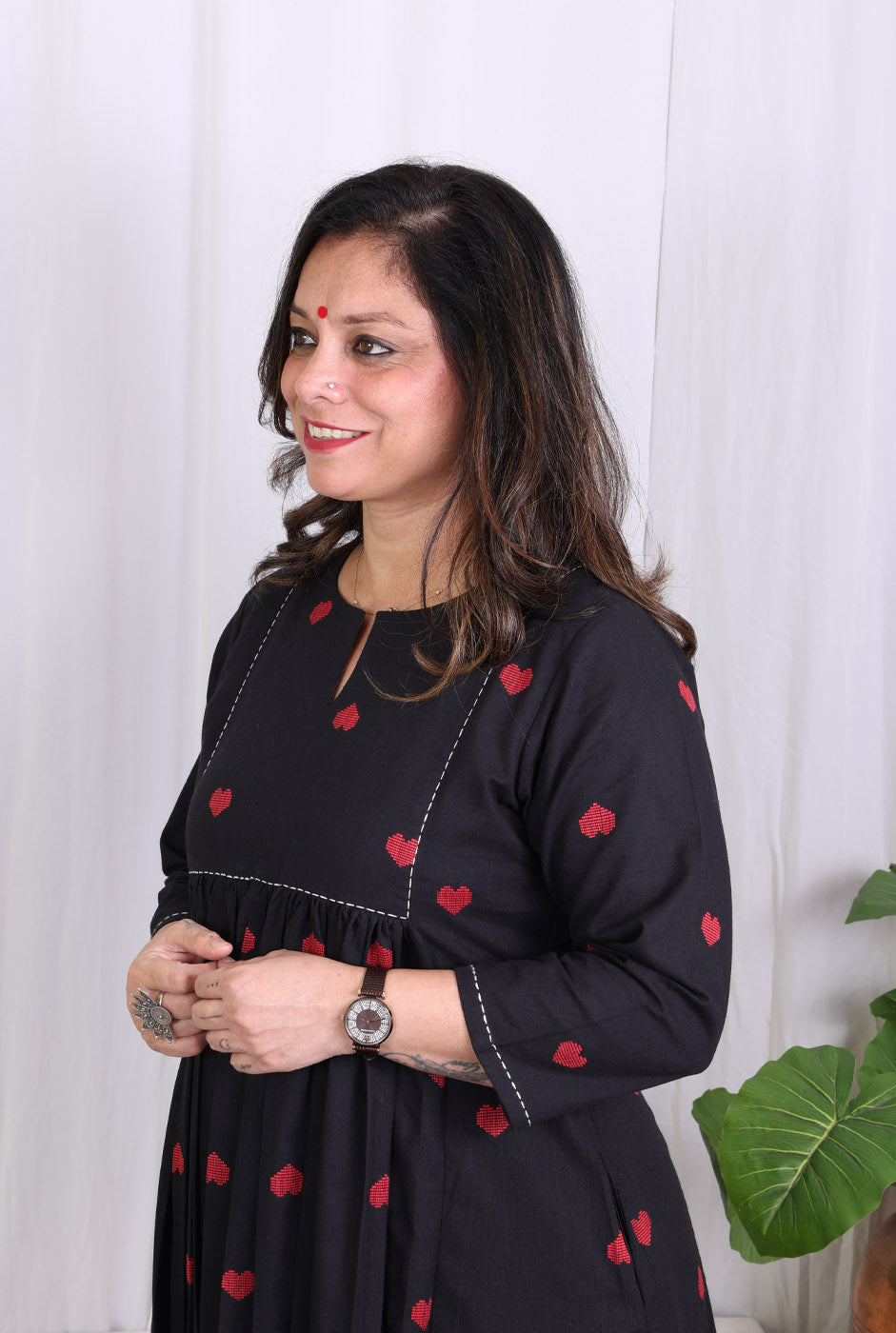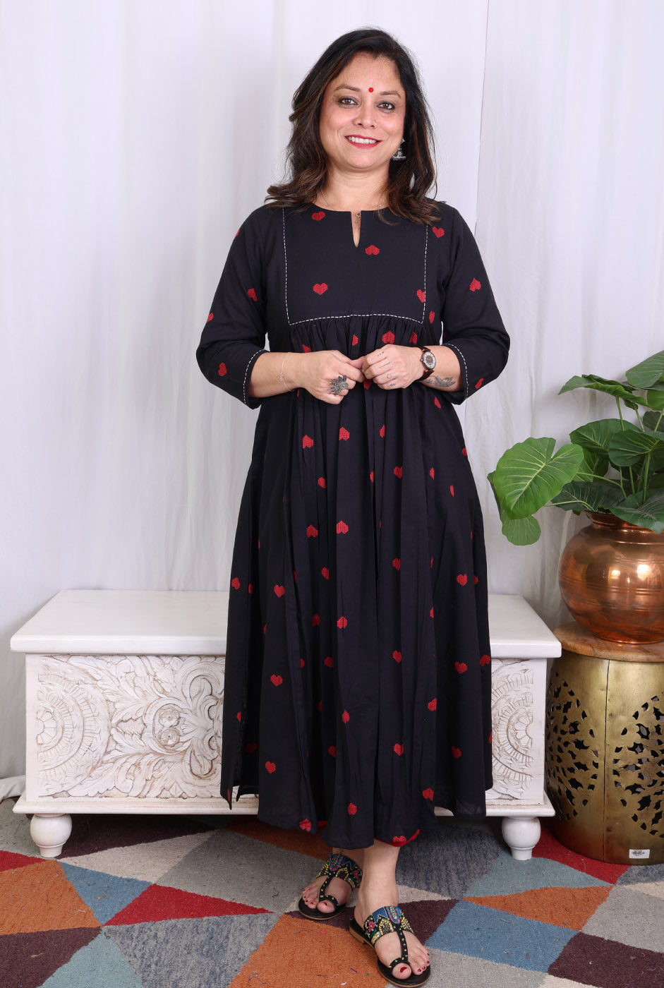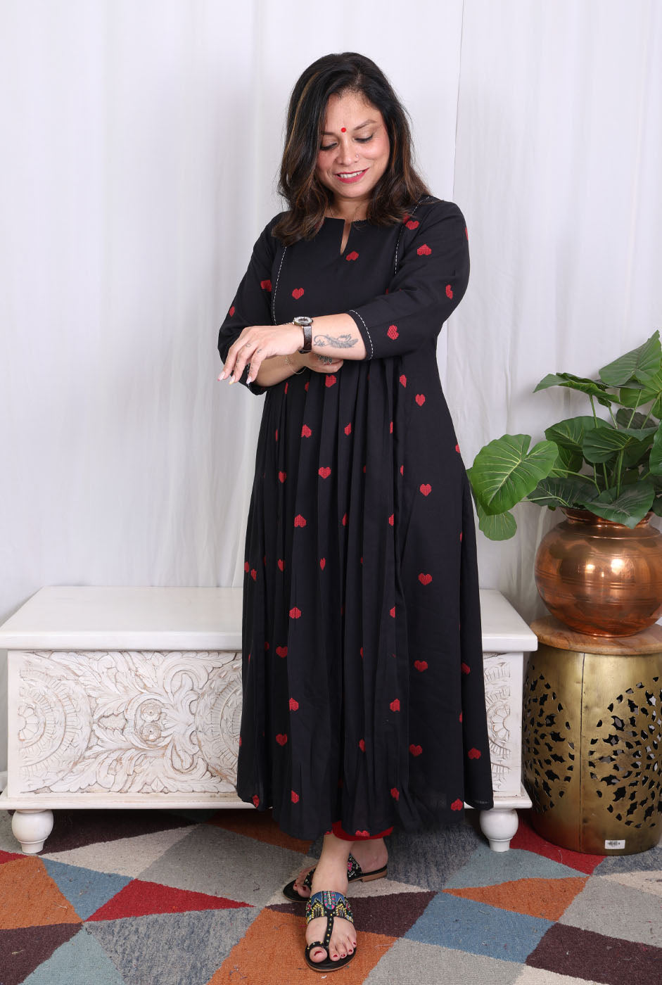 Elegant black A-line kalidar kurta with stylish gathers, blending comfort and grace for festive and casual occasions