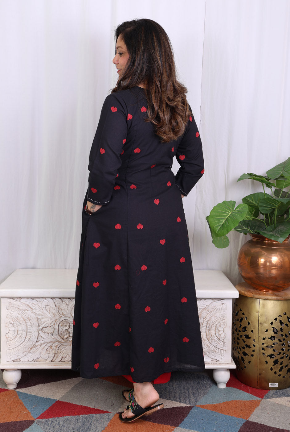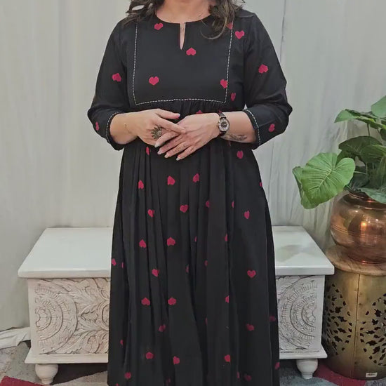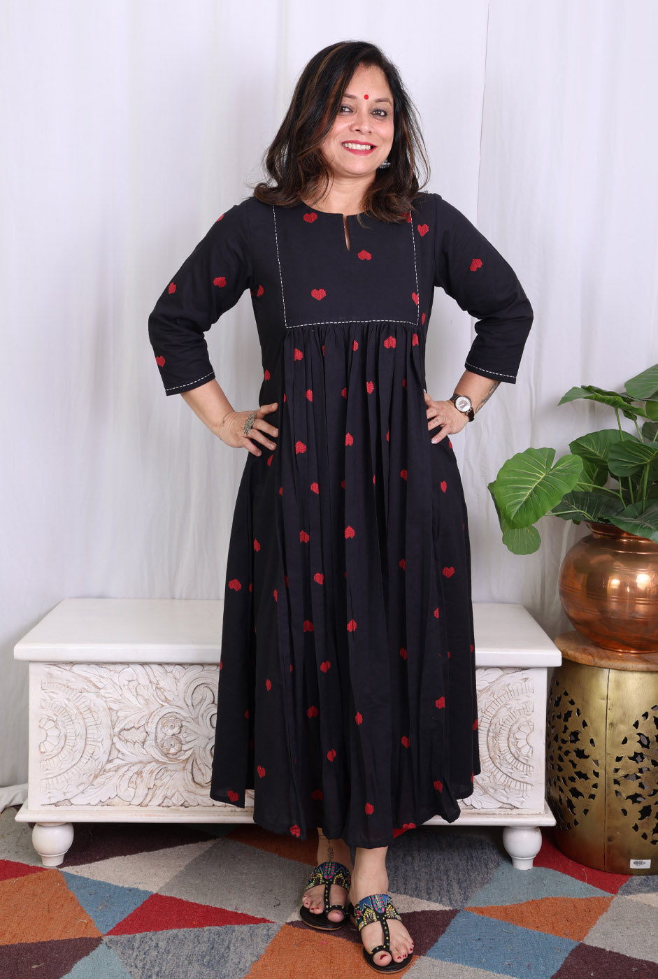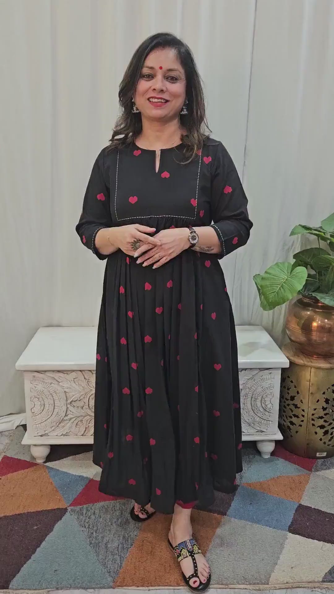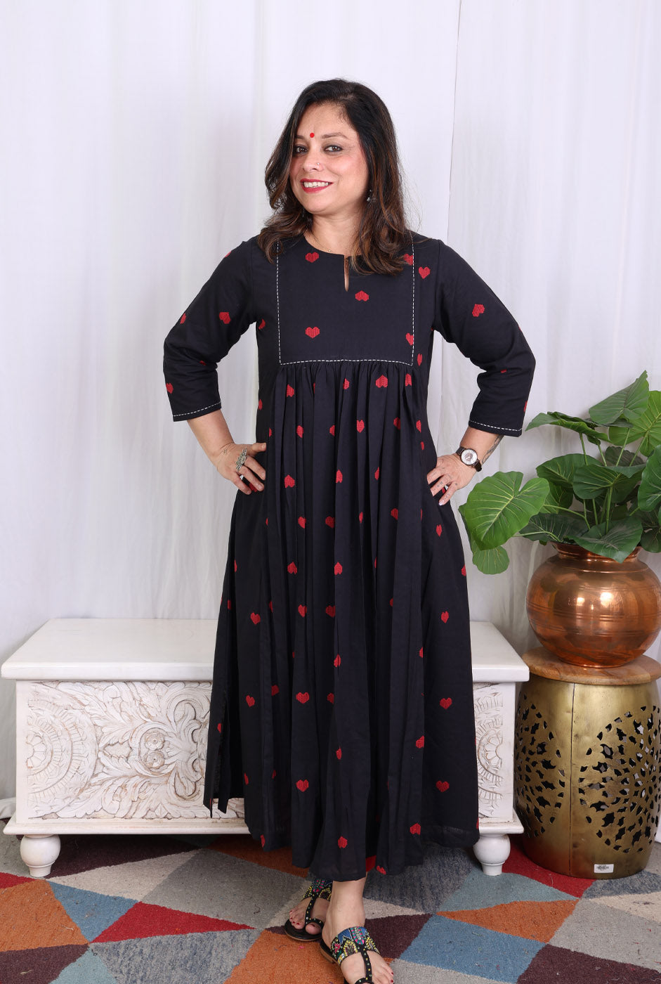 Elegant black A-line kalidar kurta with stylish gathers, blending comfort and grace for festive and casual occasions
