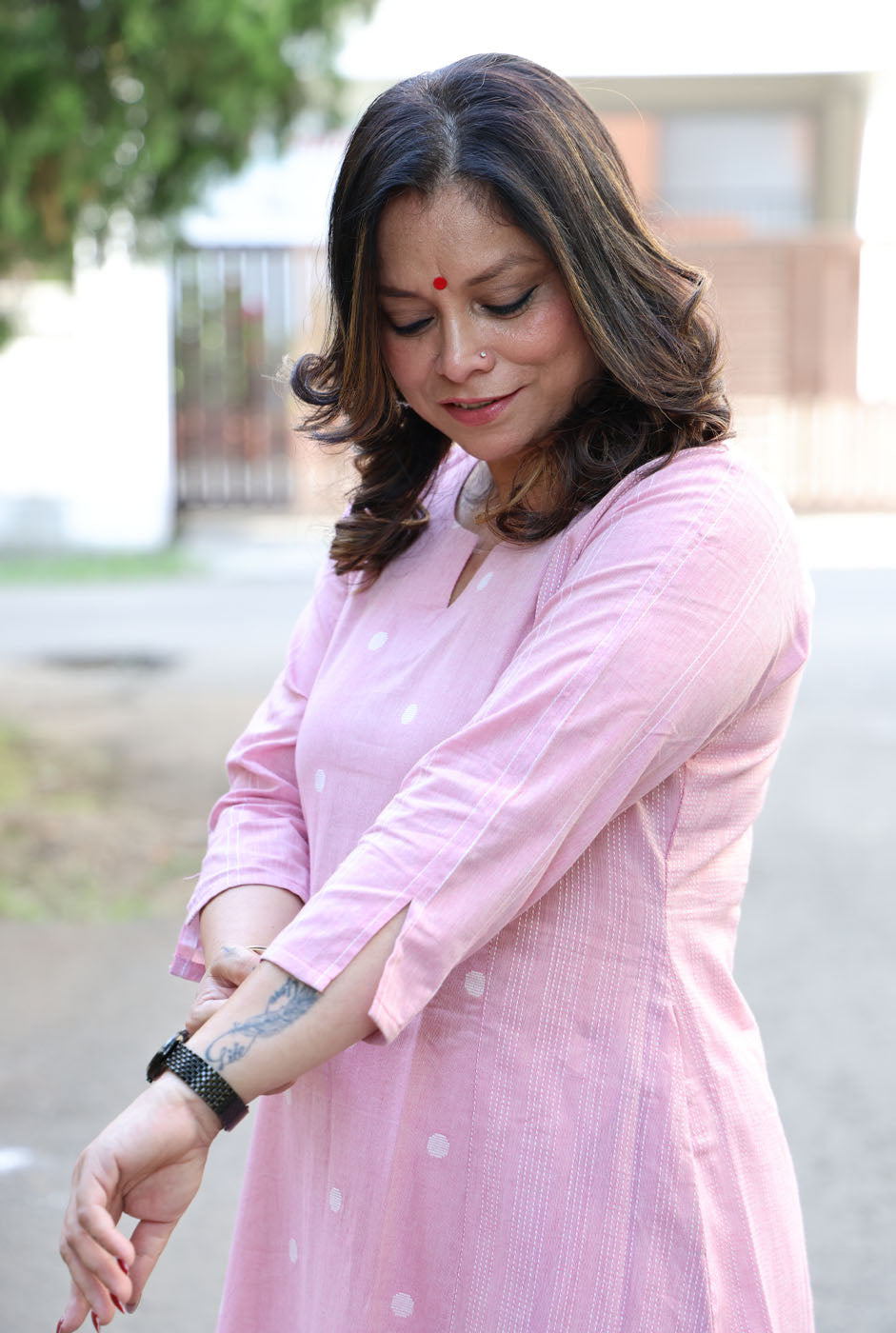 Baby pink cotton kurta with handwork detailing on the yoke. Elegant, comfortable, and perfect for casual or festive wear.