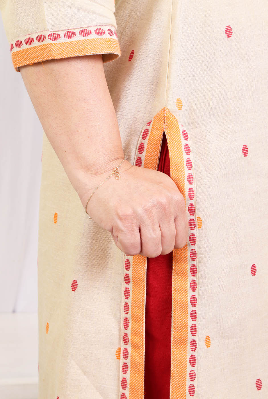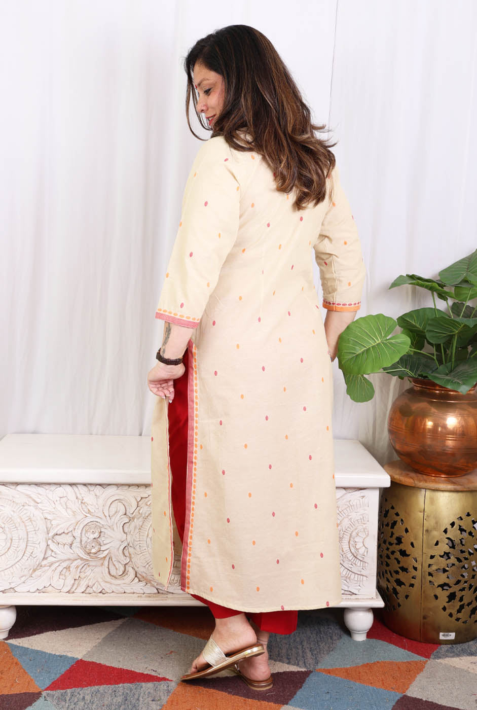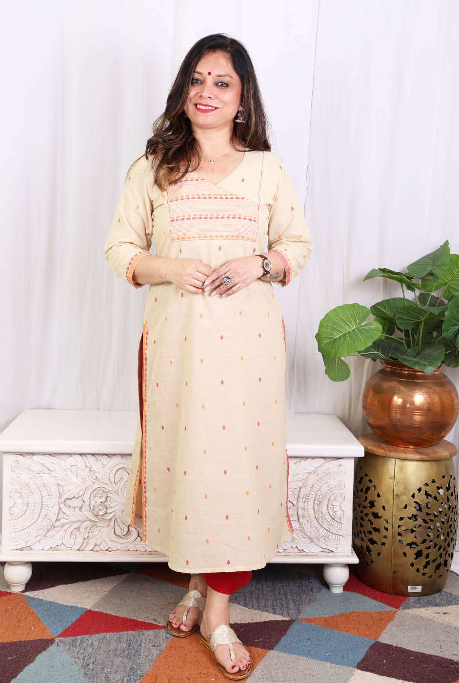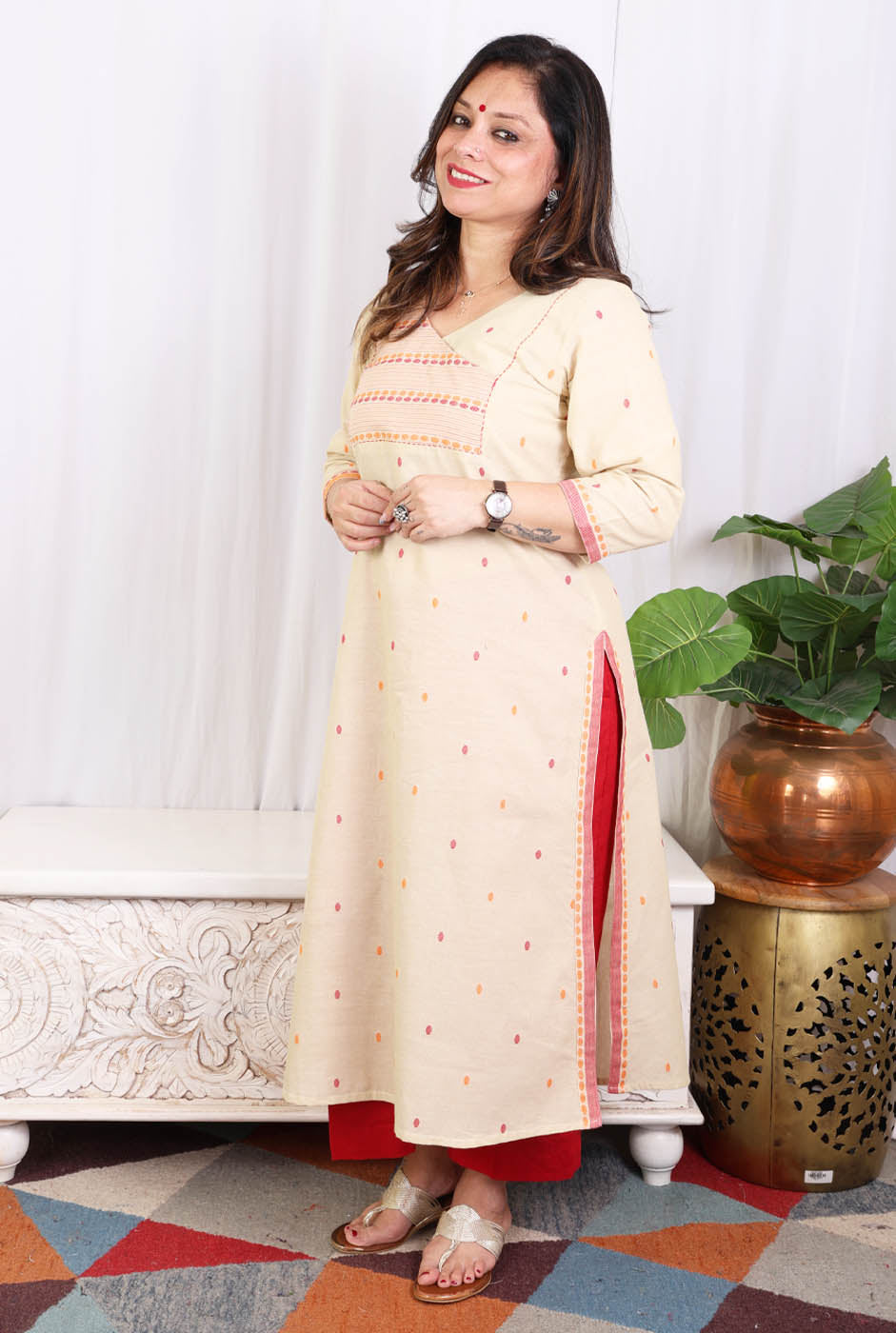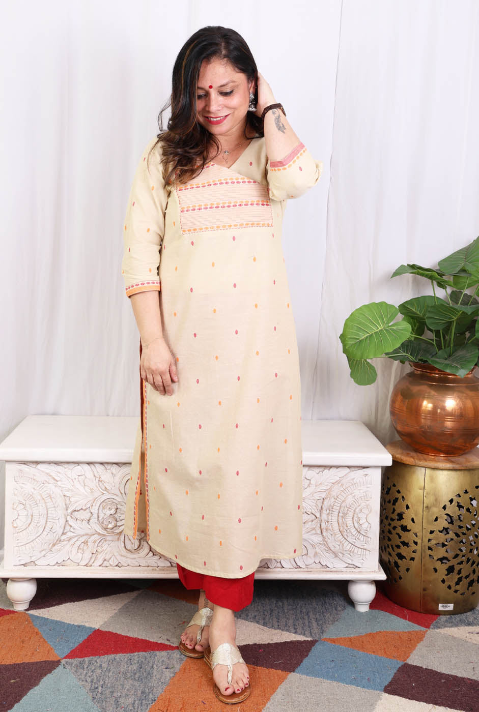 Elevate your ethnic wardrobe with this Kurta Pant Set, featuring a graceful angrakha-style yoke adorned with hand kantha embroidery. The side slit is beautifully detailed, adding a subtle yet stylish touch. Paired with matching pants, this set is a perfect balance of comfort and elegance, making it ideal for festive occasions, office wear, or casual gatherings.