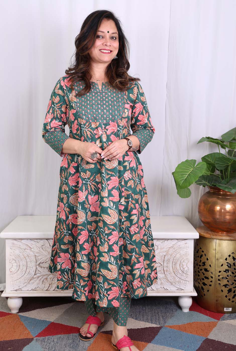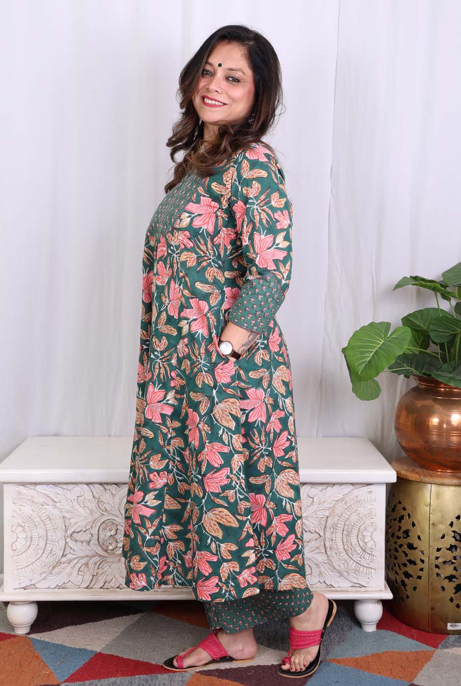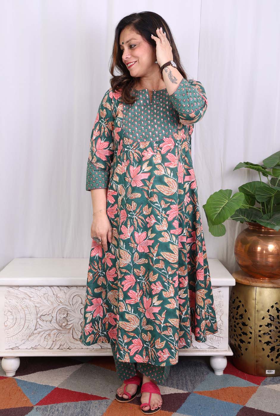Green Gulmohar Kurta Pant Set with Hand Embroidery