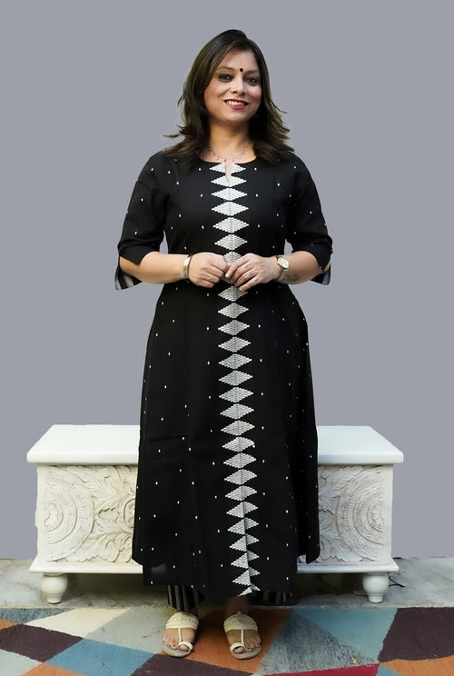 Nazakat Handloom Cotton Kurti Pant Set with sleek neck and stylish sleeves. Perfect for office wear, offering comfort and elegance in breathable Handloom Cotton fabric.
